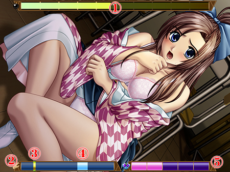 前作「特別授業」でもご好評を頂きました「服剥ぎモード」ですが、新たに設計しなおし、 ![]() ①逃亡ゲージ メーターが時間の経過と共に徐々に右側に進んで行きます。 右側一杯まで進んでしまうとターゲットに逃げられてしまいます。 ②タイミングゲージ ③ポインタ ④キャラクタースポット マウスの左ボタンを押すと、ポインタがタイミングゲージ内を左右に移動します。 マウスボタンを離すと、そこでポインタの動きは止まります。 タイミング良くキャラクタースポット上にポインタが来た時に合わせると、一気に二段階剥ぐ事が出来ます。 すべての部位を二段剥ぎで進める事ができた場合、ボーナスシナリオに入る事が出来ます。 ⑤残り枚数 あと何枚剥ぐ事ができるかを表示します。画面の場合、あと二枚剥ぐ事が出来ます。 |