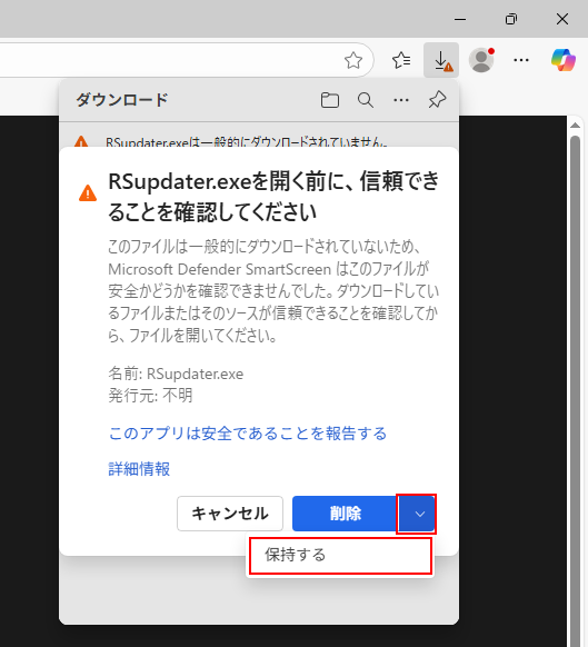※ダウンロードしたファイルが「未確認 xxxxxx.crdownload」のようになっており、正常にファイルのダウンロードが行えない場合は下記の手順に従い操作を行って下さい。